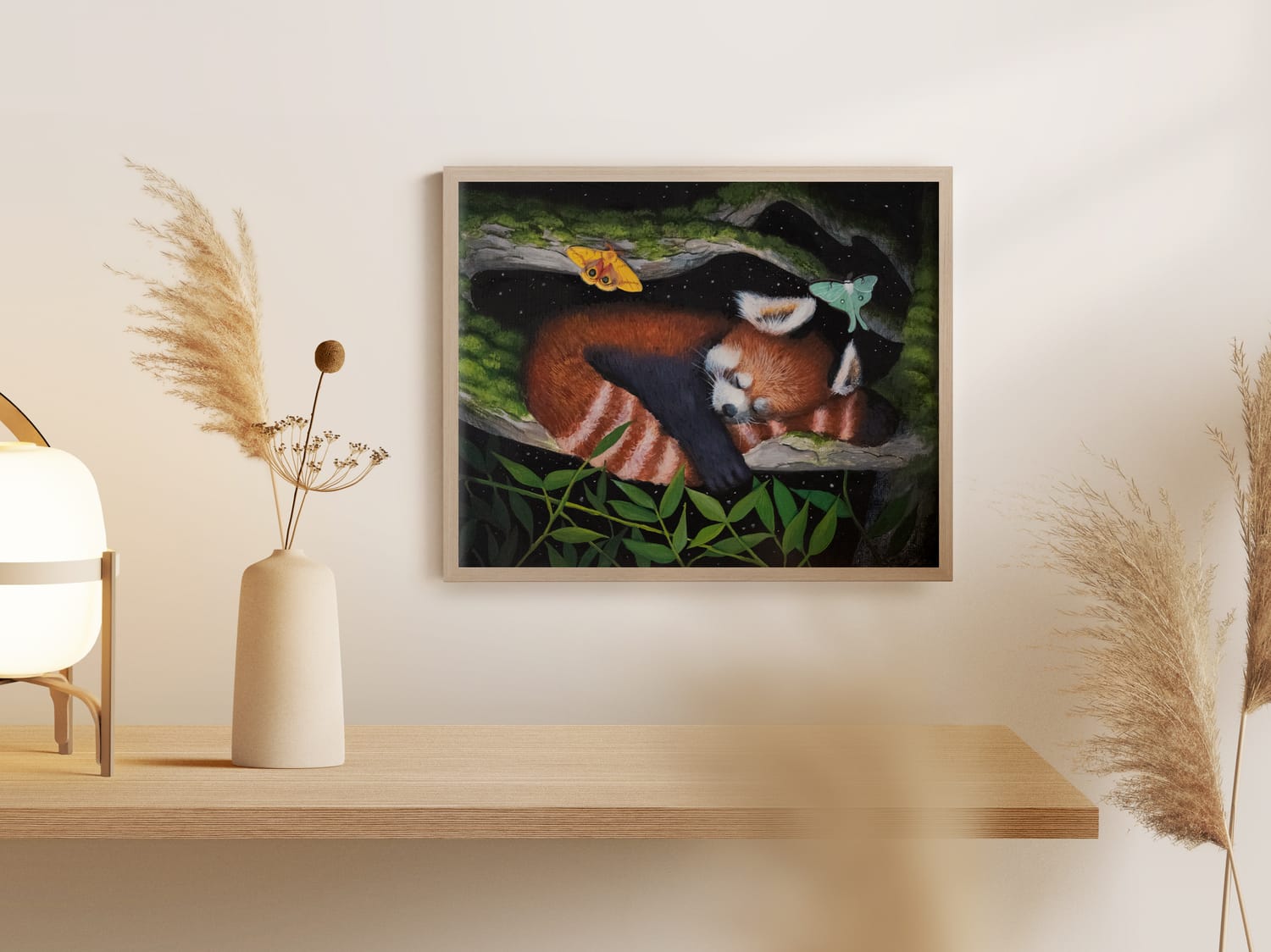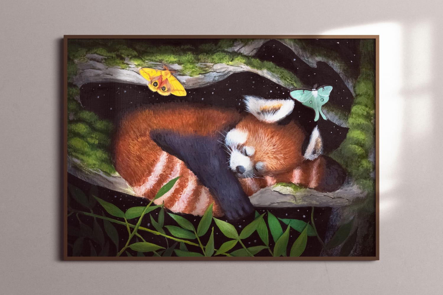 Under a velvet sky, the red panda sleeps soundly on a high branch, its fluffy tail wrapped around its body like a cozy blanket. The forest below is still, save for the occasional rustle of leaves in the cool night breeze. The panda’s breathing is slow and steady, one small paw drifts over its tail. Safe in the treetops, it dreams, unaware of the nocturnal world unfolding below. Above, the stars twinkle softly, as if keeping watch over the peaceful creature nestled in the shadows under the stars.