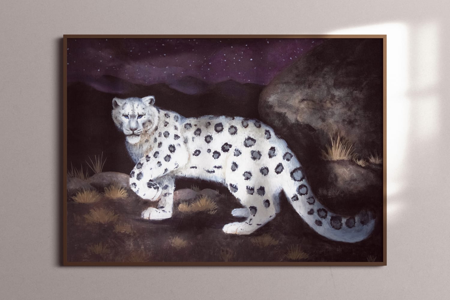 Under a starry, moonless night, a lone snow leopard prowls the frozen peaks. Its pale, mottled coat almost glows against the dark, jagged cliffs. Its paws move soundlessly over the ground, each step taken with fluid, effortless grace. The air is crisp and biting, but the leopard's senses are razor-sharp, tuned to every whisper of movement and distant sound, as it navigates the silent, frozen wilderness under the cover of night.