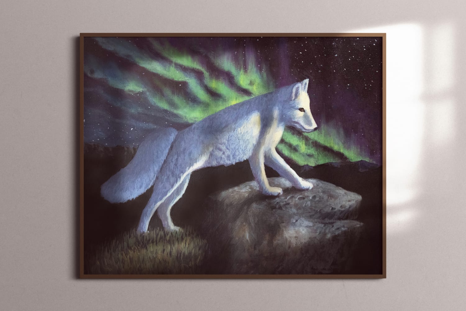 Beneath the shimmering dance of the northern lights, an Arctic fox trots silently across the tundra. Its white fur glows softly under the vibrant hues of green and purple above. The cold air bites at its fur, but the fox feels no fear—only the thrill of the night. It pauses, nose twitching, sensing movement in the distance. The world is still, except for the ethereal lights flickering across the sky, casting a magical glow on the silent, snowy landscape. The fox takes a cautious step forward, its eyes reflecting the brilliance of the aurora.