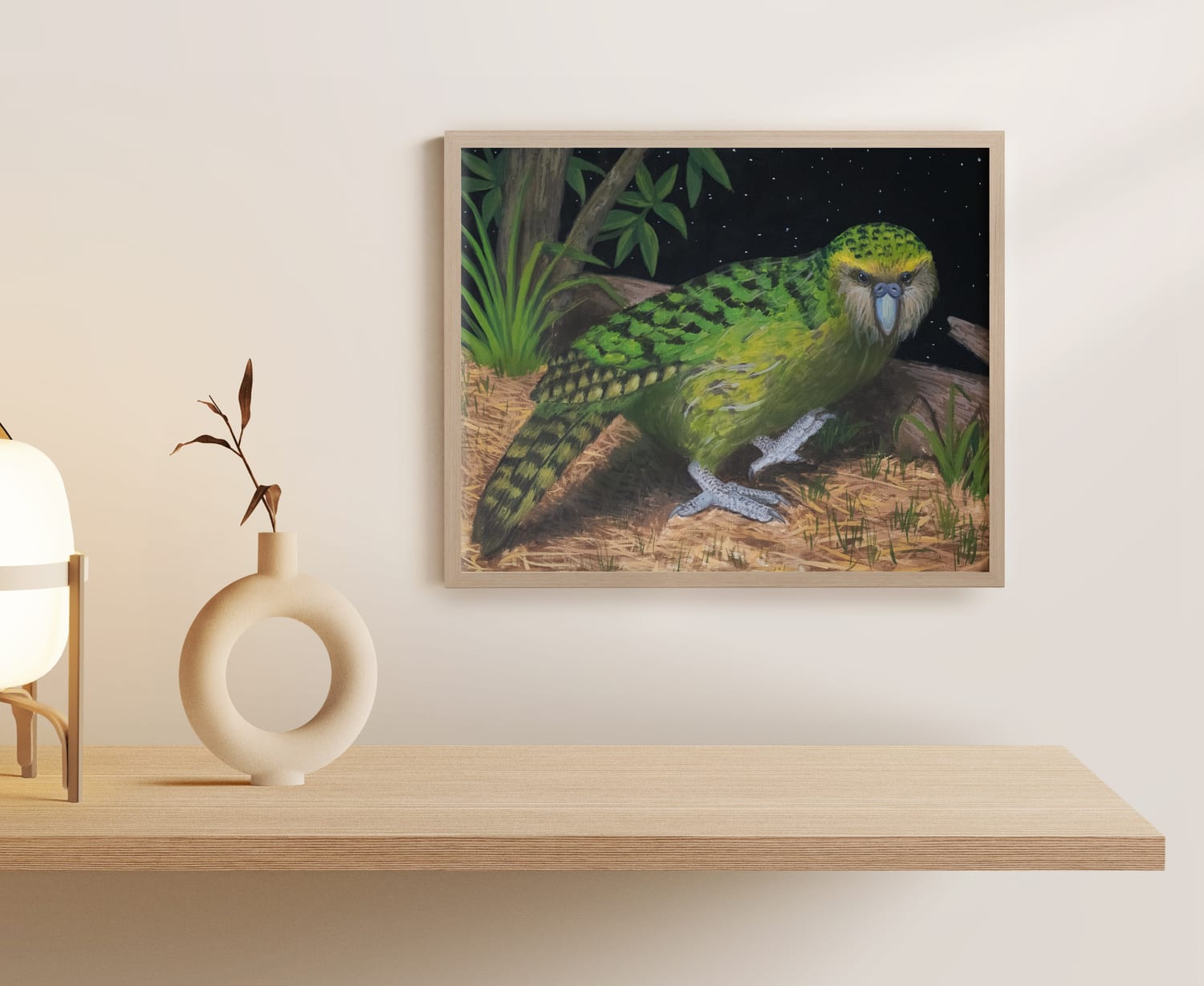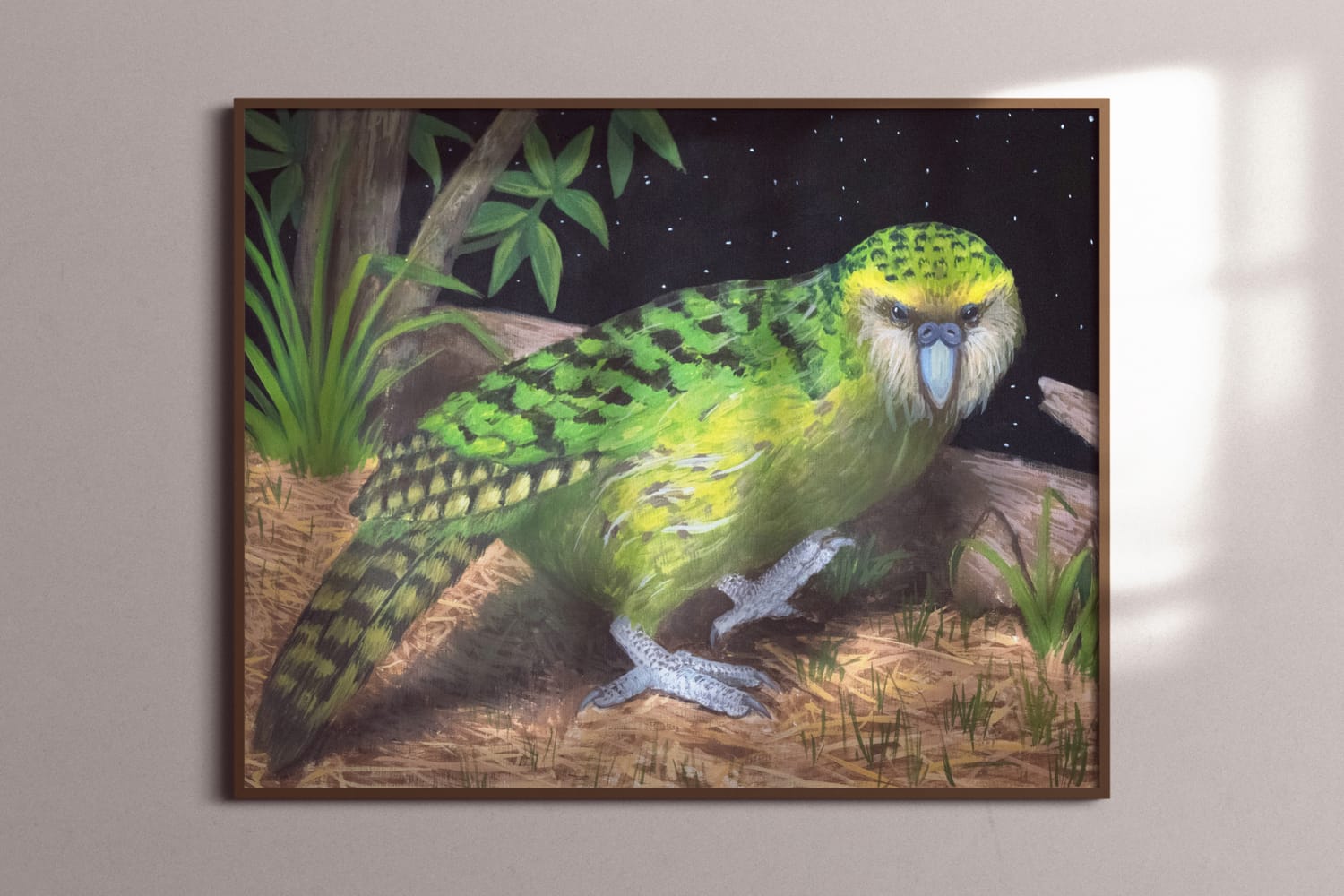 In the quiet of a starry New Zealand forest, a kakapo walks slowly through the underbrush, its rounded body low to the ground. Its soft, olive feathers shimmer faintly in the pale light, blending with the shadows of ancient trees. The night is still, save for the occasional rustle of leaves and the faint croak of distant frogs. The kakapo, with its wide, curious eyes, takes each step carefully, its heavy feet muffled against the soft earth. It pauses, sniffing the air, then continues its slow, deliberate journey.