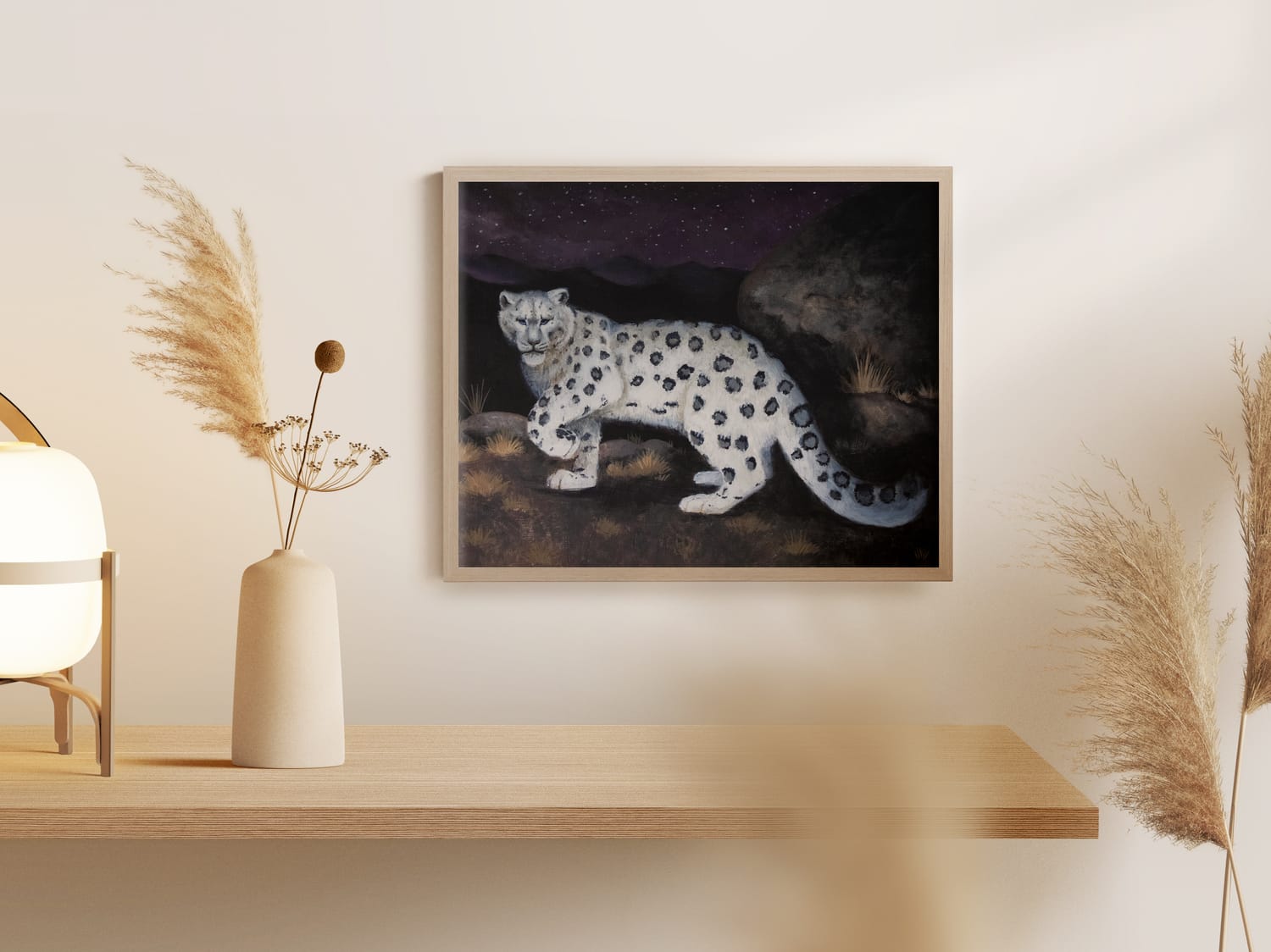 The vibrant blues, purples, and deep blacks of the night sky envelop starry luminaries. The animals’ forms are bathed in the soft glow of starlight as they carry on, disarmed, with their natural patterns.